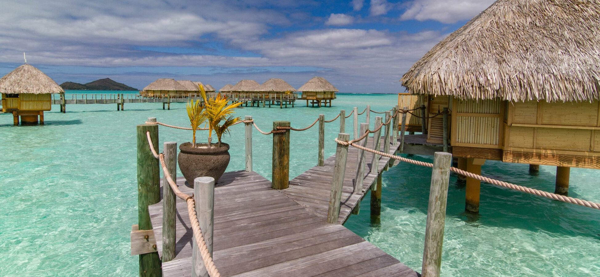 Le lagon offre des nuances de bleus somptueuses sur fond de sable blanc. On gagne les hôtels par bateau-taxi, fendant une eau d’une limpidité parfaite. Les bungalows sur pilotis offrent une vue somptueuse sur le mont Otemanu.